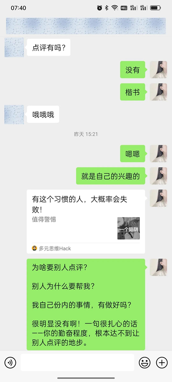 但换位思考一下,如果一个群几十个伙伴,书法老师一天都在点评,那他自己的个人生活安排呢?他又靠什么获得收入?