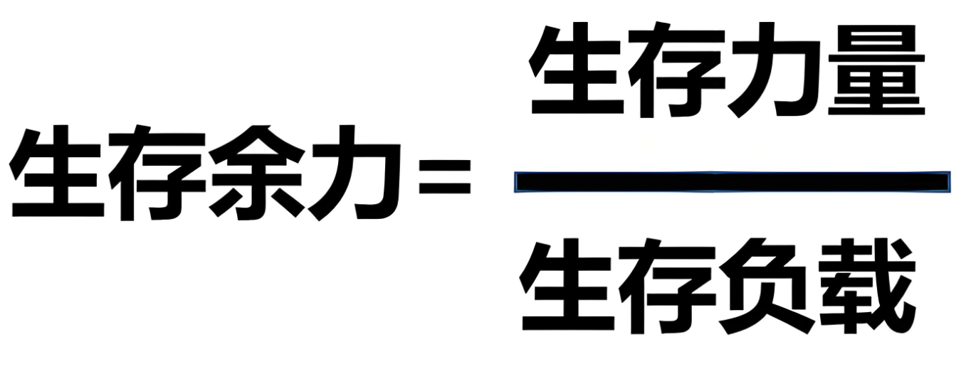 一个人的生存余力=生存力量÷生存负载,生存余力的基本观点是:一个人总是在他需要的精力与可提供的精力之间寻求平衡。那些,需要消耗精力的事情叫做“生存负载”,而处理这些生存负载所需的精力叫“生存力量”。