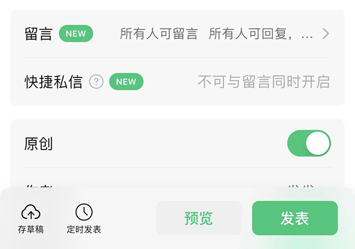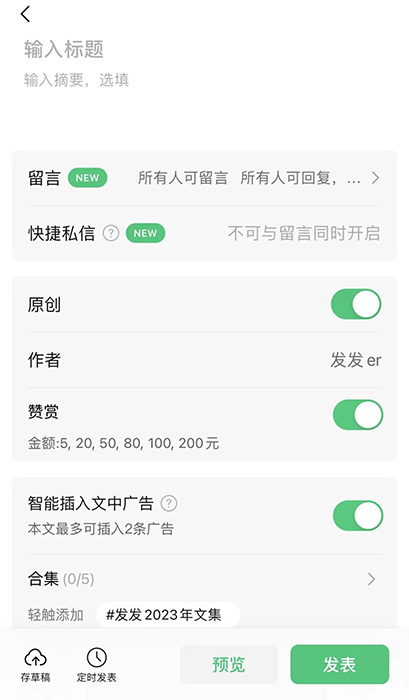 2、打开原创、留言、输入作者名、打开赞赏等功能