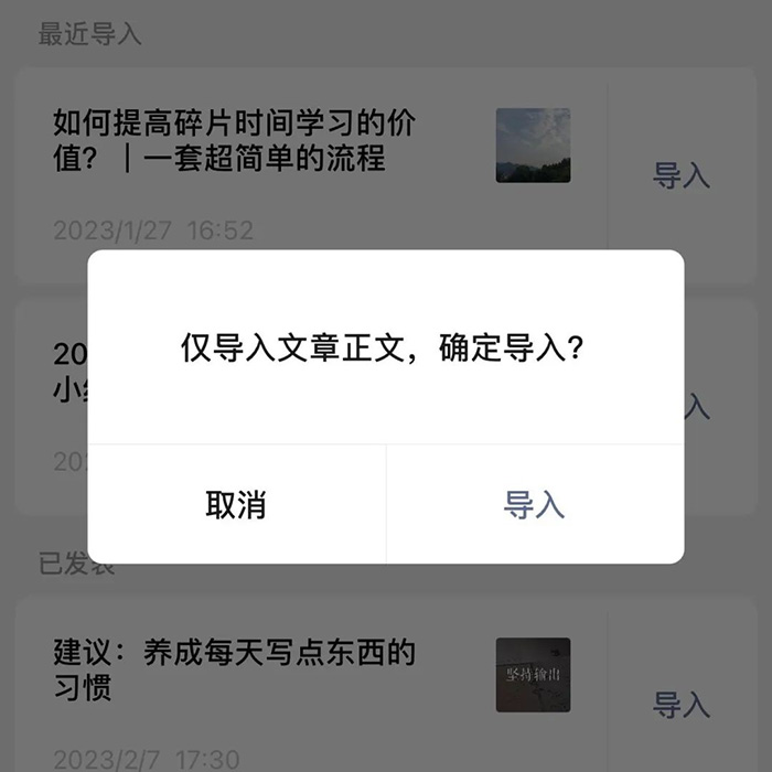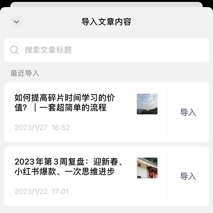 点了导入文章内容后,会看到已发布的文章列表,选择想要的那篇文章就好。