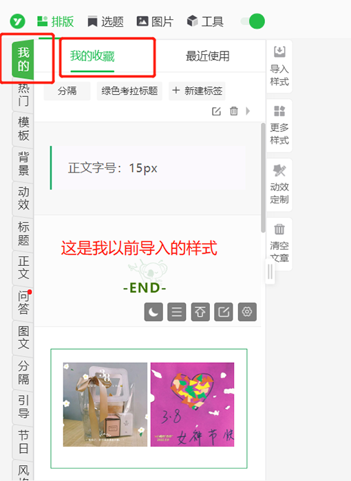 但有3个功能我还在用:①字体设置,选择默认;②图片的边框设置;③原来收藏的设计样式,比如我的考拉标题、绿色的引用样式,都是原来存好的,现在还能用。