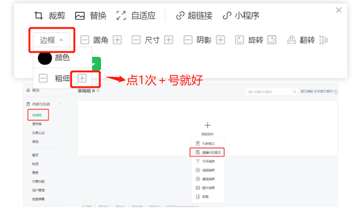 操作方法:点击要编辑的图片→出现的两行菜单里,点击边框→点1次+号,点击次数越多,边框越粗。